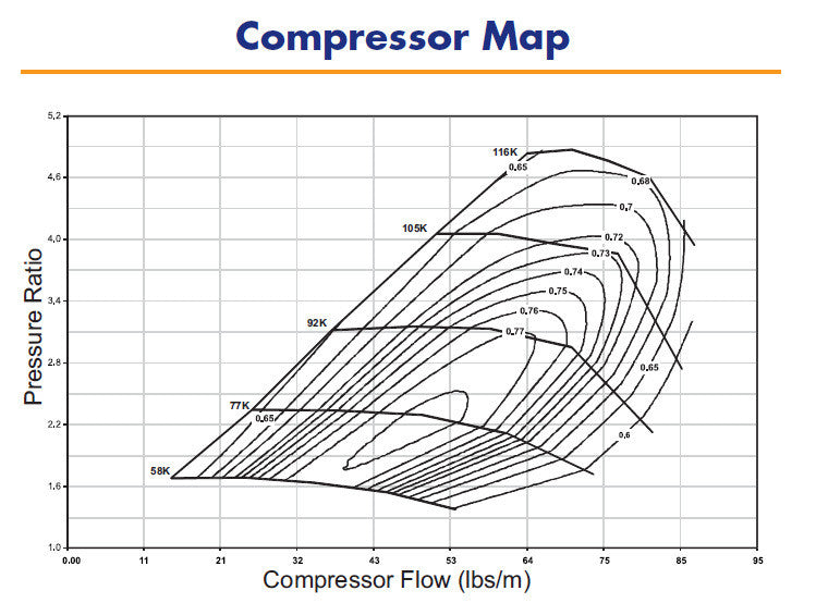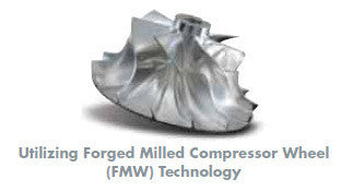The compressor stage starts with a ported shroud housing, including integrated velocity stack. Compressor wheel is BorgWarner's "FMW" forged-milled-wheel (AKA forged-billet) and uses the latest generation blade aero to reach ~94 lb/min max compressor flow. This is a journal bearing oil cooled only turbocharger ideally suited to competitive drag racing.